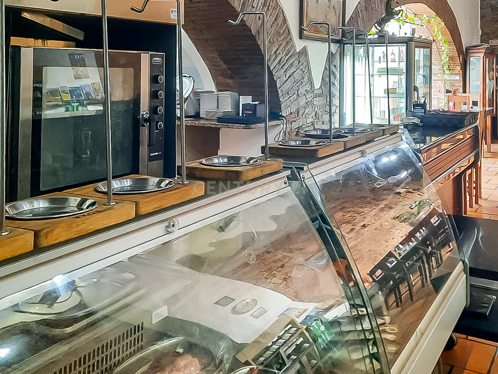 Este espaço comercial tem de área total 170 m2 estando subdividido em sala interior de pé direito-124 m2, situada a seguir ao pátio com esplanada- 46m2 .